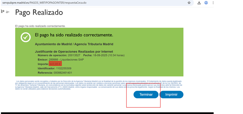 - Confirmación del pago, para ello, debe pulsar el botón Terminar: