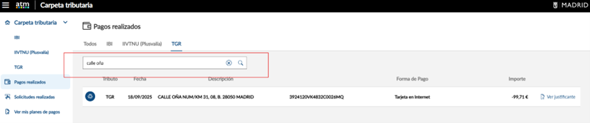 Para encontrar fácilmente el objeto tributario y sus pagos asociados se ha introducido un buscador que permite localizarlo con rapidez entre todos los que tenga asociados. La búsqueda se realizará por descripción (la dirección postal).