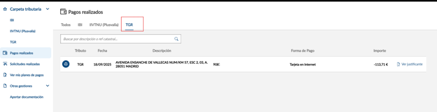 En la selección aparecen pagos indicado el Tributo, la Fecha, la Descripción, la Forma de Pago, el Importe. Además, se puede ver el justificante de pago (y descargarlo) pulsando sobre la opción “Ver justificante”.
