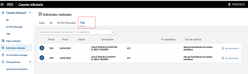En la opción solicitudes realizadas del menú lateral izquierdo, también podrá filtrar por TGR: