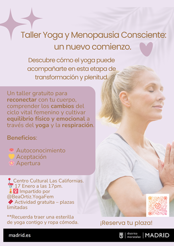 - 17 enero 2026. Menopausia Consciente: un nuevo comienzo. Descubre cómo el yoga puede acompañarte en esta transición vital. Beneficios: autoconocimiento, aceptación, apertura.
