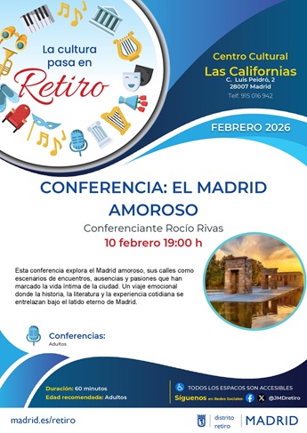 - Esta conferencia explora el Madrid amoroso, sus calles como escenarios de encuentros, ausencias y pasiones que han marcado la vida íntima de la ciudad. Un viaje emocional donde la historia, la literatura y la experiencia cotidiana se entrelazan bajo el latido eterno de Madrid.