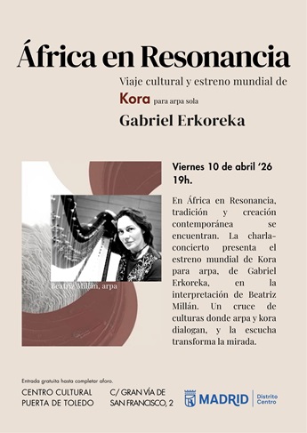 Estas reflexiones encuentran su expresión musical en el estreno mundial de Kora para arpa, de Gabriel Erkoreka, interpretado en directo por la arpista Beatriz Millán, una obra que explora el encuentro entre tradiciones africanas y el lenguaje musical contemporáneo occidental.