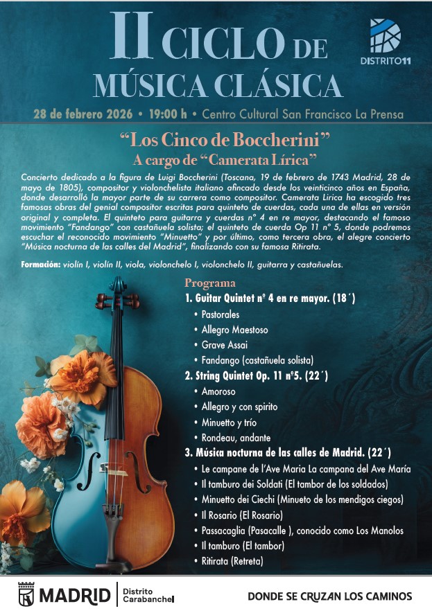 Concierto dedicado a la figura de Luigi Boccherini (Toscana, 19 de febrero de 1743 Madrid, 28 de mayo de 1805), compositor y violonchelista italiano afincado desde los veinticinco años en España, donde desarrolló la mayor parte de su carrera como compositor. Camerata Lirica ha escogido tres famosas obras del genial compositor escritas para quinteto de cuerdas, cada una de ellas en versión original y completa. El quinteto para guitarra y cuerdas nº 4 en re mayor, destacando el famoso movimiento “Fandango” con castañuela solista; el quinteto de cuerda Op 11 nº 5, donde podremos escuchar el reconocido movimiento “Minuetto” y por último, como tercera obra, el alegre concierto “Música nocturna de las calles del Madrid”, finalizando con su famosa Ritirata.
