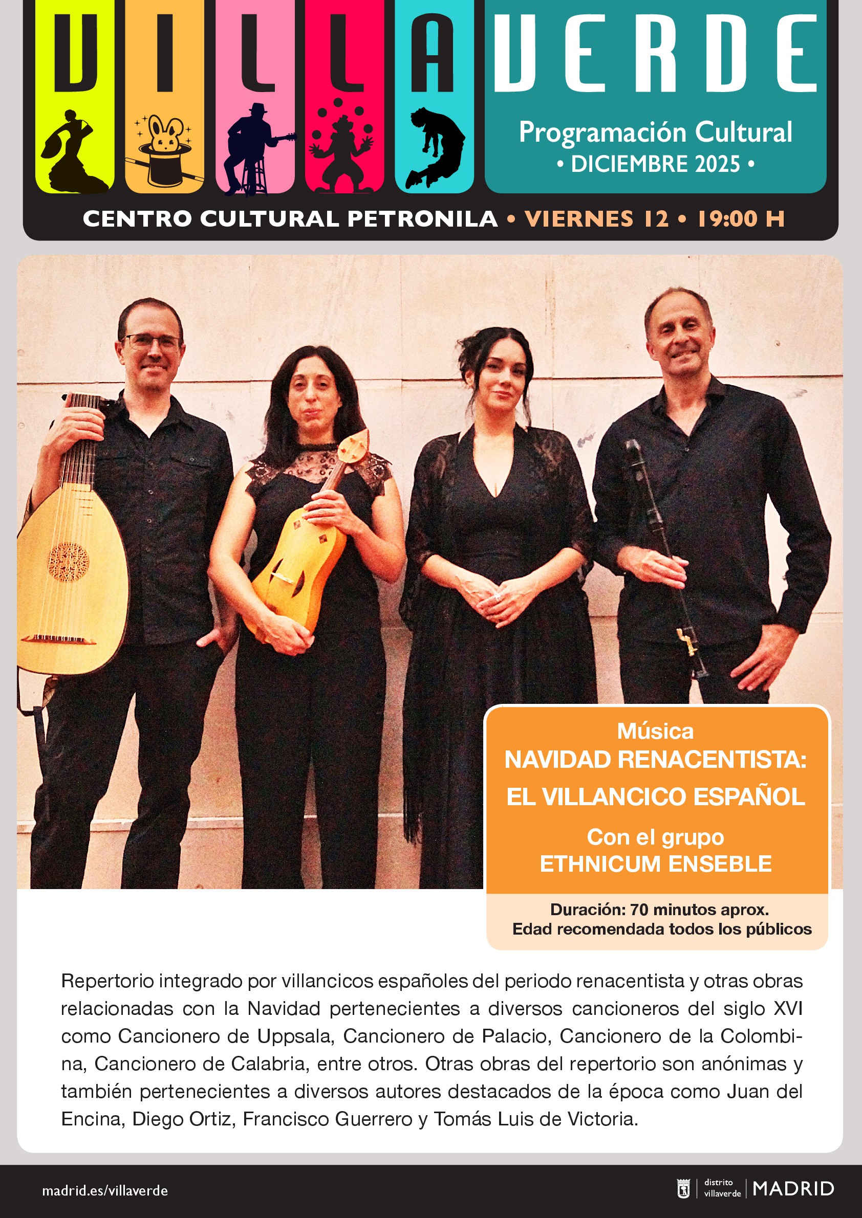 Sinopsis: Repertorio integrado por villancicos españoles del periodo renacentista y otras obras relacionadas con la Navidad pertenecientes a diversos cancioneros del siglo XVI como Cancionero de Uppsala, Cancionero de Palacio, Cancionero de la Colombina, Cancionero de Calabria, entre otros. Otras obras del repertorio son anónimas y también pertenecientes a diversos autores destacados de la época como Juan del Encina, Diego Ortiz, Francisco Guerrero y Tomás Luis de Victoria.