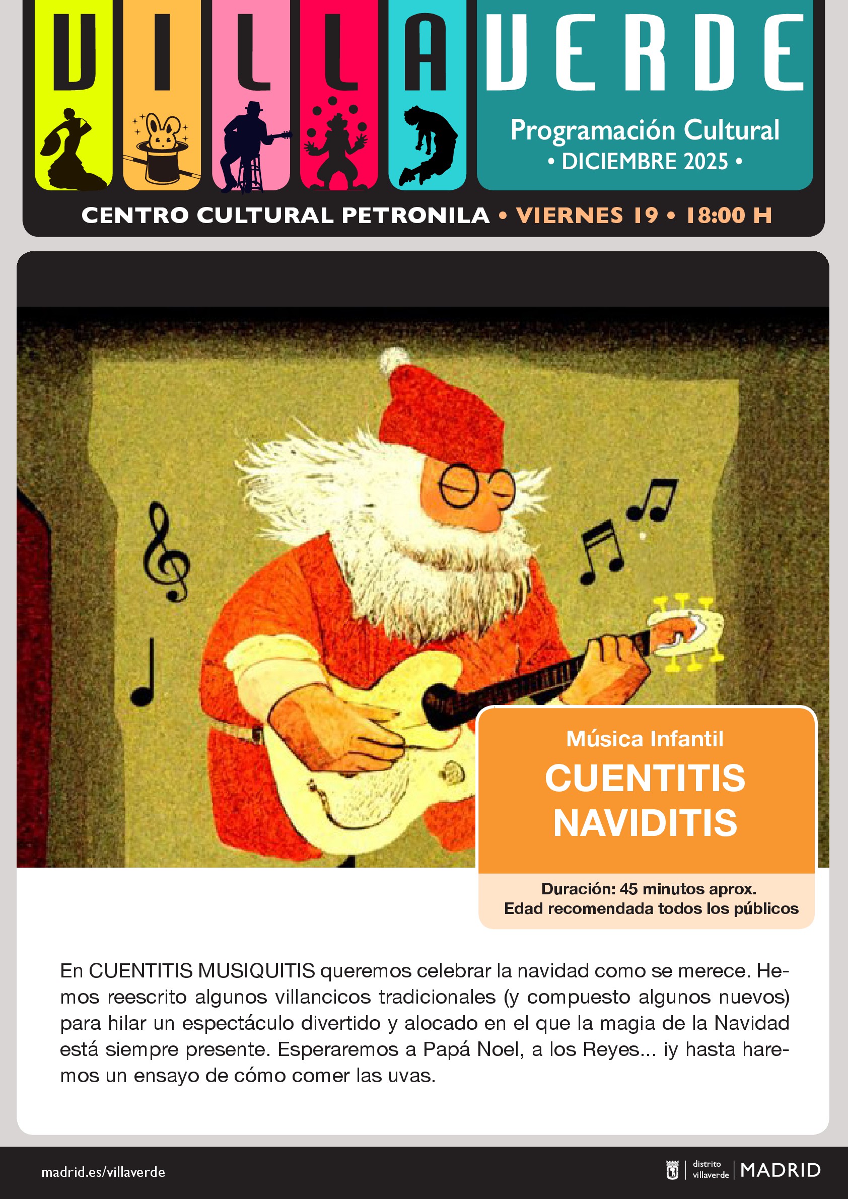 Sinopsis: En Cuentitis Musiquitis queremos celebrar la navidad como se merece. Hemos reescrito algunos villancicos tradicionales (y compuesto algunos nuevos) para hilar un espectáculo divertido y alocado en el que la magia de la Navidad está siempre presente. Esperaremos a Papá Noel, a los Reyes... iy hasta haremos un ensayo de comer uvas!.