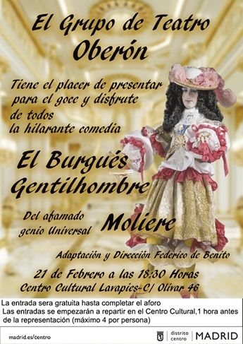 Entrada libre y gratuita hasta completar el aforo (80 personas) Las entradas se reparten 1 hora antes de la representación (4 por persona)