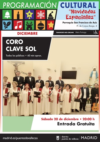 El Coro Clave de Sol es una agrupación coral de adultos mayores con más de 15 años de trayectoria, formada en el Centro de Día Puente de Vallecas. A lo largo de su historia, han ofrecido presentaciones en diversos escenarios de la Comunidad de Madrid. En esta ocasión, bajo la dirección de Ricardo Durán Barney, presentan un programa navideño que combina villancicos tradicionales, populares y andaluces, ofreciendo al público una rica diversidad de melodías festivas llenas de alegría y emoción.