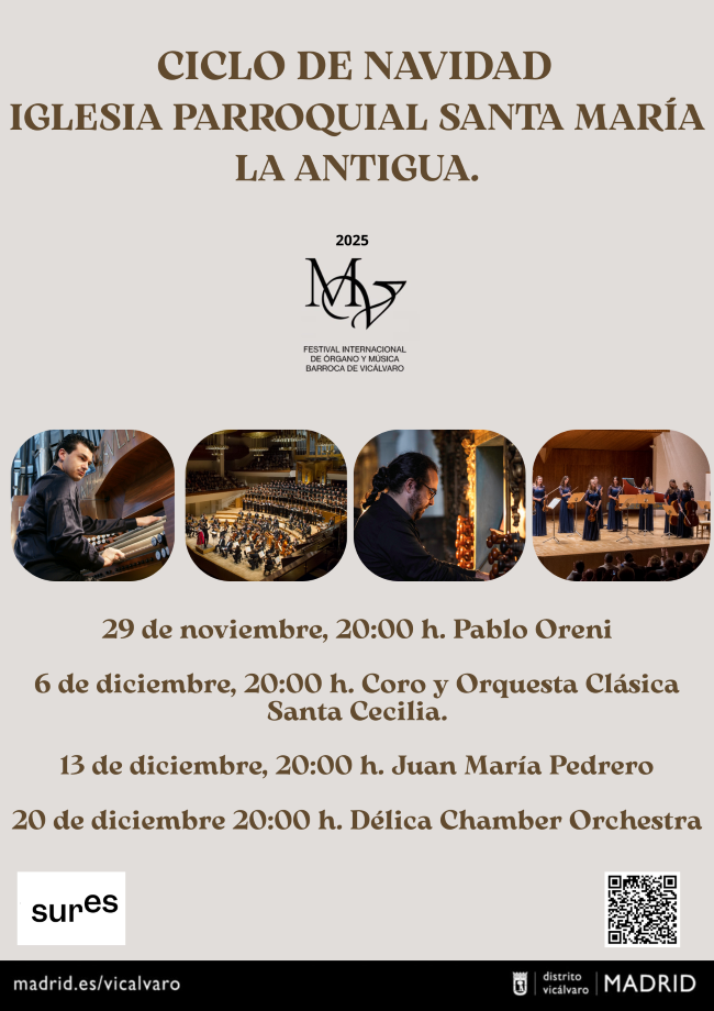 Del 29 de noviembre al 20 de diciembre de 2025, la Iglesia de Santa María La Antigua (Vicálvaro) acoge un ciclo único que celebra la riqueza del órgano y la música barroca. Grandes intérpretes y formaciones internacionales ofrecerán conciertos que combinan tradición y virtuosismo.