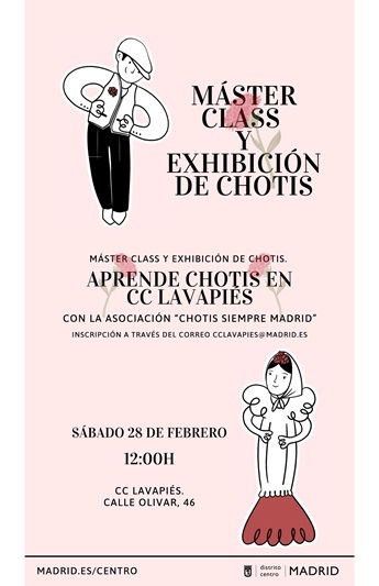 - Como cada último sábado de mes, tenemos chotis en el Centro Cultural de Lavapiés. Ya lo hicimos en el primer semestre, y vamos a seguir. El último sábado de cada mes te esperamos para aprender a bailar Chotis con la Asociación de Chotis Siempre Madrid, y al final disfrutaremos de una pequeña exhibición.