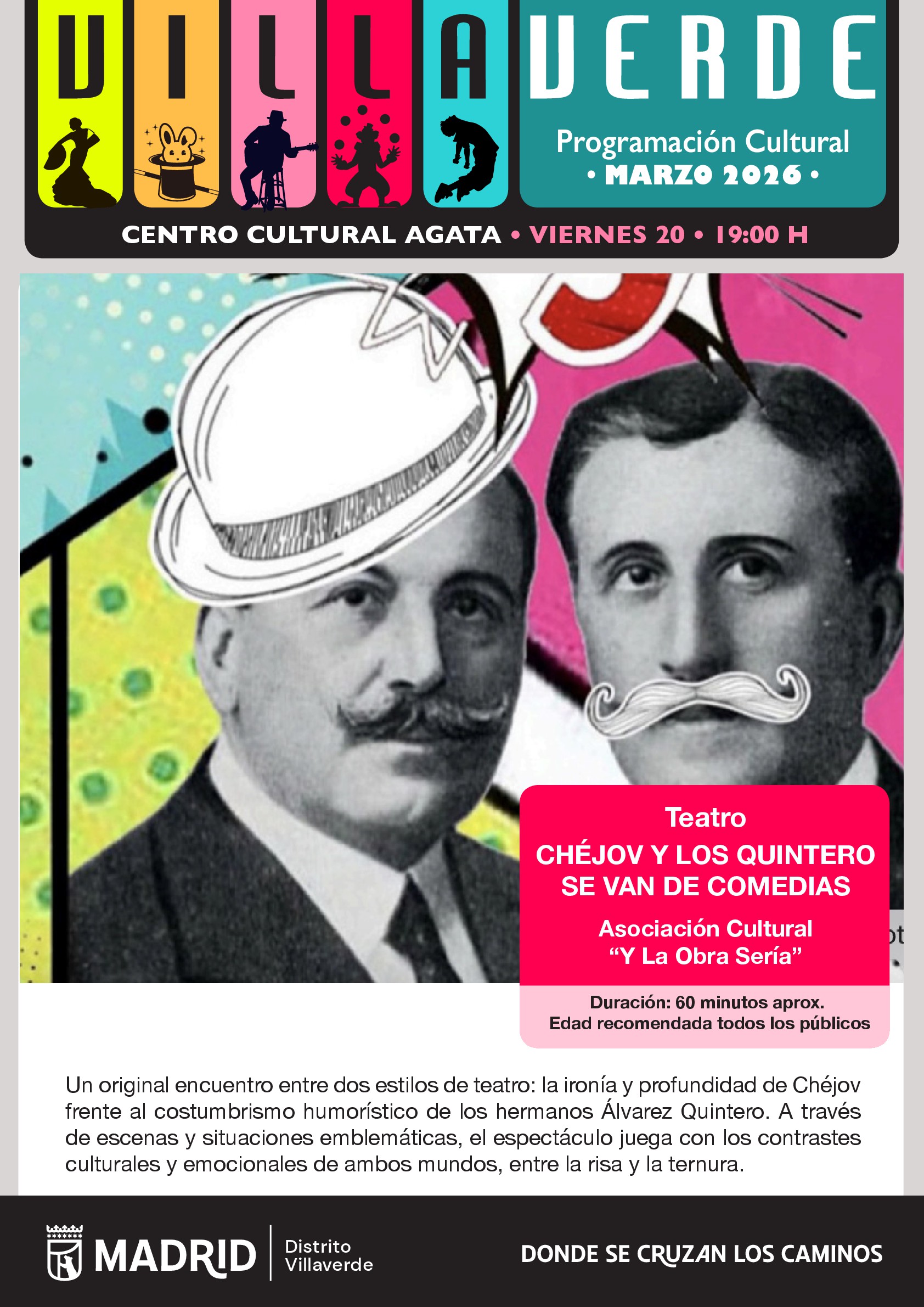 Sinopsis: Un original encuentro entre dos estilos de teatro: la ironía y profundidad de Chéjov frente al costumbrismo humorístico de los hermanos Álvarez Quintero. A través de escenas y situaciones emblemáticas, el espectáculo juega con los contrastes culturales y emocionales de ambos mundos, entre la risa y la ternura.